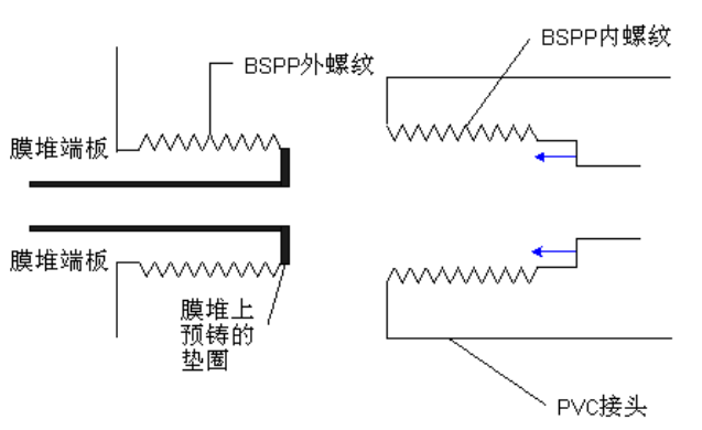 正確的將管道接頭連接到此兩類膜堆時不需要單獨的墊圈(膜堆端板上的每個接口處已經(jīng)預(yù)鑄了一個橡膠墊圈)。下圖為正確連接方式: