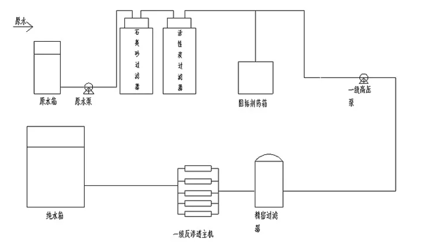 從上圖我們可以看到單級反滲透設(shè)備的工藝流程是原水→原水箱→原水增壓泵→石英砂過濾器→活性炭過濾器→樹脂過濾器→阻垢劑系統(tǒng)→精密過濾器→高壓泵→反滲透主機→純水箱。